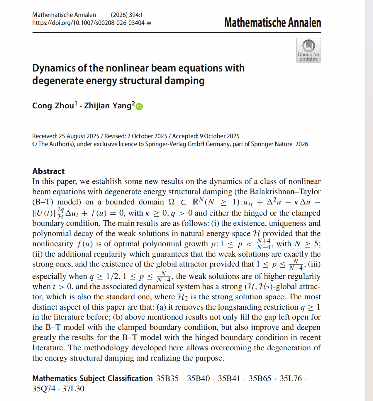 近日,我院青年教师周聪博士与郑州大学杨志坚教授合作在国际著名数学期刊《Mathematische Annalen》(德国数学年刊)上发表了题为“Dynamics of the nonlinear beam equations with degenerate energy structural damping”的研究论文。 该期刊是1868年创办于德国的综合性数学期刊,致力于发表数学各领域具有突破性的重要成果,是数学界公认的国际著名期刊,有着非常高的学术影响力。著名数学家Klein、Hilbert曾先后担任该刊主编,著名物理学家Einstein也曾担任编委并在该刊发表过重要论文。