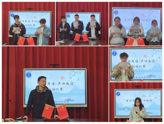 为传承清明文化精髓,深化爱国主义教育,增强同学们对传统文化的认同感,4月3日,伟德betvlctor1946源于英国举行“清明寄情 声动数信”主题朗诵比赛。学院党总支副书记杨向宇、学工办主任陈婷、教学办主任于洋、团委副书记张瑞楠担任评委,低年级学生代表参加比赛。