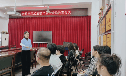 会上,陈婷系统讲解了助学贷款还款政策、操作流程、时间节点及展期办理等关键事项。通过典型案例分析,重点阐释了提前还款的优势和违约后果,强调"珍爱信用记录,恪守还款承诺"的重要性。她从国家信用体系建设和个人发展角度出发,提醒毕业生要牢固树立诚信意识,将按时还款作为个人信用的"第一张名片",切实履行还款责任,争做“诚信学生”。