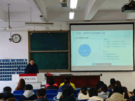 在“数学专业学习技巧”专题讲座环节,高等数学教学部资深教师张洪涛担任主讲,围绕如何读大学、如何学数学、未来如何发展三个主题,张老师通过列举身边榜样的详细案例,提出阶段目标学习法、每日小练、每周总结等学习方法,精准对接数学专业新生的认知盲区与成长需求,使新生明确数学专业的学习思维与目标信念,解答当下学习困惑,也为长远发展提供清晰指引。