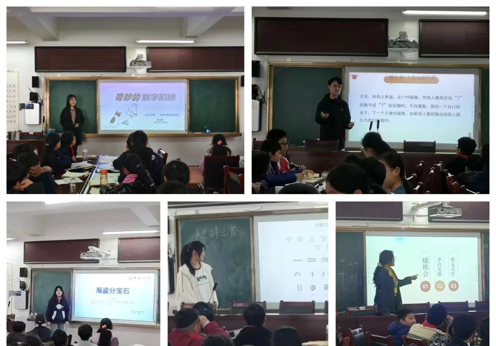 课堂之上,大学生讲师团的成员们各展才华,教学妙招频出。研221班的周子方创意十足地引入课前小游戏“声东击西”,瞬间点燃了孩子们的参与热情。在游戏过程中,孩子们深刻领悟到集中注意力的关键作用,其反应能力与思维敏捷性得到显著锻炼,同时也真切感受到游戏背后所蕴含的智慧光芒。信科211班的王珊则带来了引人入胜的“海盗分宝石”数学趣味游戏,巧妙地引导孩子们深入探究数字与逻辑的紧密关联,启发他们发现解决问题的多元路径,创新思维的火花在孩子们的心中不断绽放。